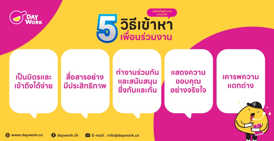 ในการทำงานร่วมกับผู้อื่น เราต้องรู้จักที่จะเข้าหาเพื่อนร่วมงาน อย่ารอแค่ให้เพื่อนร่วมงานต้องเข้าหาเราฝ่ายเดียว การเข้าหาเพื่อนร่วมงานเป็นการเข้าหาเพื่อทำความรู้จักซึ่งกันเเละกัน รวมไปถึงเพื่อเพิ่มประสิทธิภาพในการทำงาน แล้วเราจะเข้าหาเพื่อนร่วมงานด้วยวิธีไหนดีล่ะ ? วันนี้ Daywork มี 5 วิธีเข้าหาเพื่อนร่วมงานมาบอกต่อ