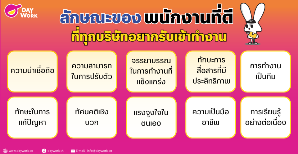 พนักงานที่ดีควรมีคุณสมบัติที่ช่วยให้สภาพแวดล้อมของการทำงานมีประสิทธิผลมากยิ่งขึ้น มีคุณลักษณะและพฤติกรรมที่ทำให้เป็นที่นับถือและสำคัญในสถานที่ทำงาน บทความนี้ Daywork จะพาไปดูกันว่า ลักษณะของพนักงานที่ดี ที่ทุกบริษัทอยากรับเข้าทำงาน มีอะไรบ้าง