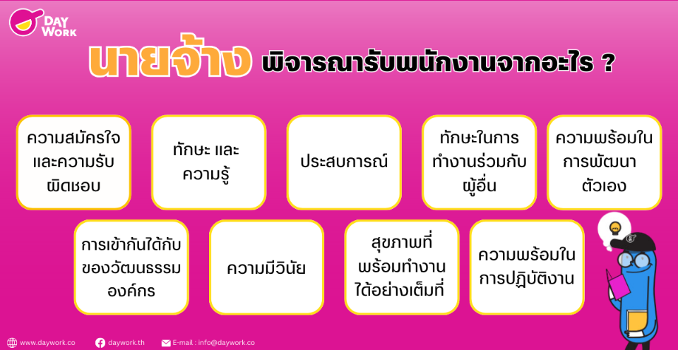 คำว่า "พนักงาน" มีความหมาย เป็นบุคคลที่ได้รับจ้างทำงานหรือทำหน้าที่ตามที่นายจ้างหรือองค์กรกำหนด พนักงานมีหน้าที่ทำงานตามคำสั่งหรือกำหนดการที่ได้รับมอบหมายและได้รับค่าตอบแทนตามข้อตกลงที่กำหนดไว้ แล้วนายจ้างเขาพิจารณาการรับพนักงานจากอะไรบ้างนะ บทความนี้ Daywork จะพาไปแอบดูนายจ้าง ว่าเขารับพนักงานเข้ามาทำงาน เขาพิจารณาจากอะไรบ้าง ไปดูกันเล้ยยยย