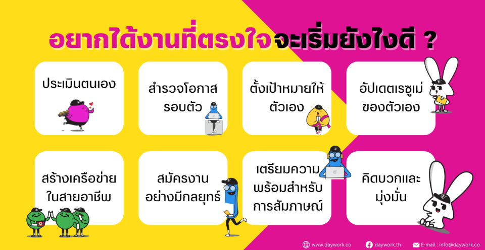 การหางานที่เหมาะสมอาจต้องใช้เวลาและความพยายาม แต่ด้วยแนวทางและความมุ่งมั่นที่เป็นระบบ เราจะสามารถเพิ่มโอกาสของเราได้ และได้งานที่ตรงกับความต้องการของเราแน่นอน Daywork เป็นกำลังใจให้ทุกคนที่กำลังพยายามอยู่นะคะ สู้ๆน้า