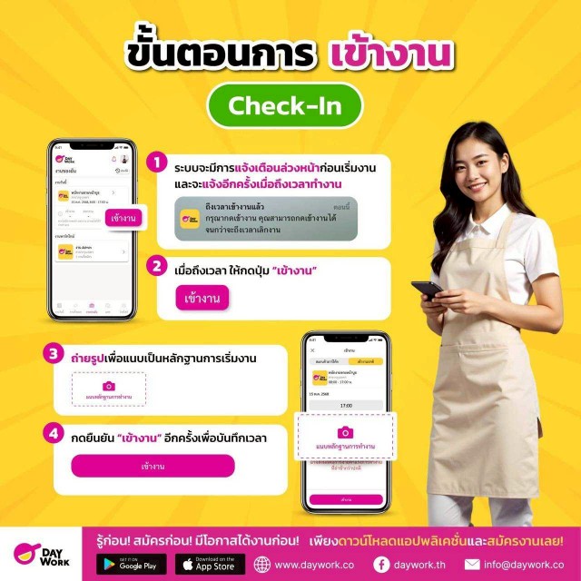 วิธีเช็คอิน - เมื่อถึงเวลาเข้างาน ให้กดเข้าแอป Daywork → ไปที่เมนู “งานของฉัน” → กด “เข้างาน” → ถ่ายรูปแนบหลักฐานการเข้างาน (สามารถกดได้ก่อนเวลาเริ่มงาน 1 ชั่วโมง)
