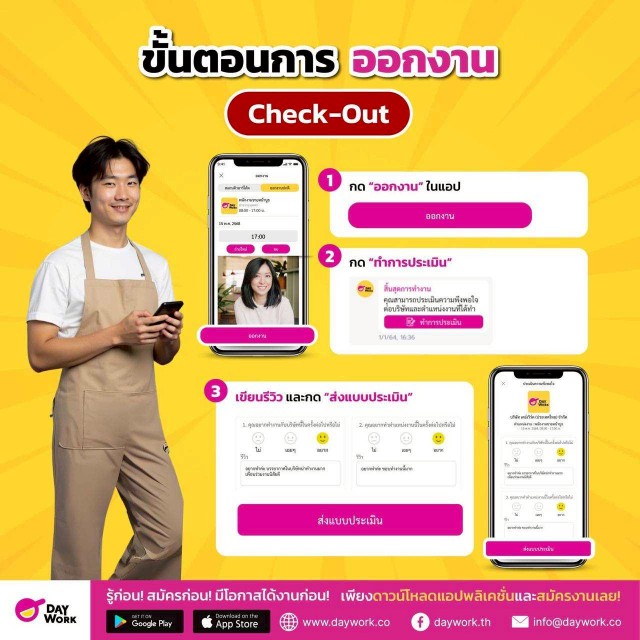 วิธีเช็คเอาท์ - เมื่อถึงเวลาเลิกงาน ให้กดเข้าแอป Daywork → ไปที่เมนู “งานของฉัน” → กด “ออกงาน” → ถ่ายรูปแนบหลักฐานการออกงาน