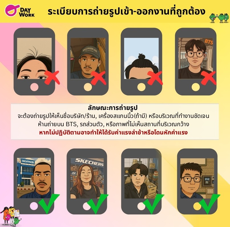 ควรกดเช็กอินเข้างาน และเช็กเอาท์ออกงาน ในบริเวณที่ทำงานเท่านั้น! โดยถ่ายรูปหลักฐานให้เห็นตนเองชัดเจน และบริเวณสถานที่ทำงาน
