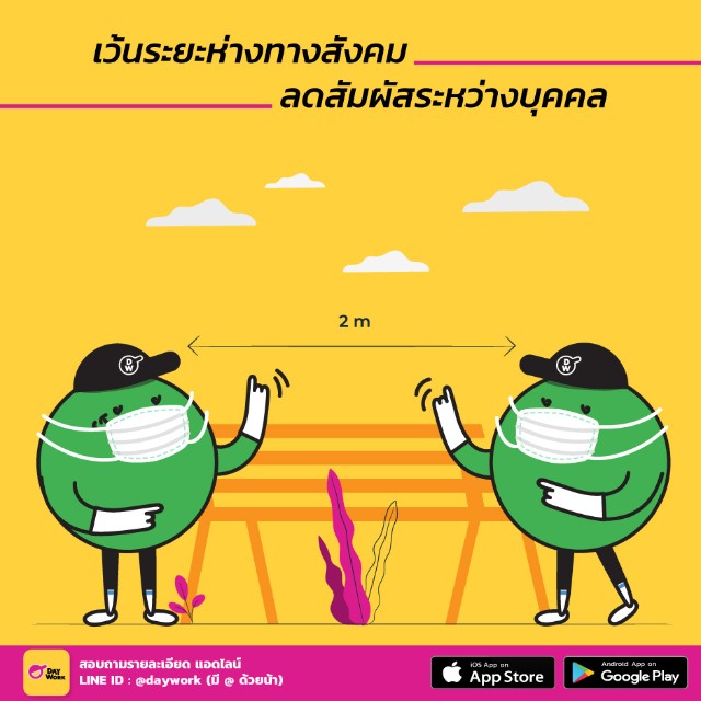 การเว้นระยะห่างทางสังคม ลดสัมผัสระหว่างบุคคล ตามมาตรการลดการแพร่ระบาดของเชื้อไวรัส Covid-19 ซึ่งควรเว้นระยะห่างระหว่างบุคคลอย่างน้อย 1.5 - 2 เมตร และสวมใส่หน้ากากอนามัยเมื่อออกไปข้างนอกหรืออยู่ในที่ชุมชน ต่อจากนี้ไปการแตะเนื้อต้องตัวกันก็คงต้องเป็นไปอย่างระมัดระวังมากขึ้น