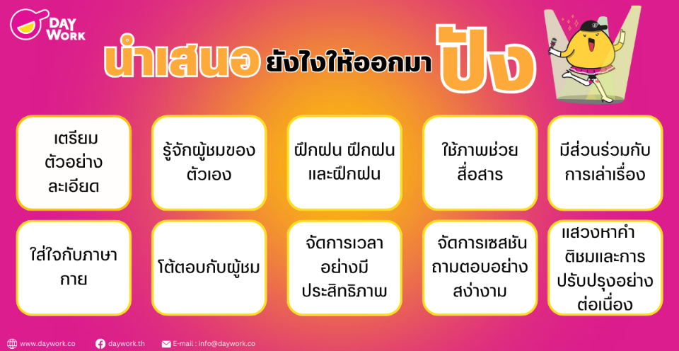 การฝึกฝนและความพากเพียรเป็นกุญแจสำคัญในการฝึกฝนทักษะการนำเสนอของตัวเอง ด้วยเวลาและความพยายาม เราสามารถเป็นผู้นำเสนอที่มั่นใจและมีประสิทธิภาพได้ สู้ๆน้า Daywork เป็นกำลังใจให้ทุกคน