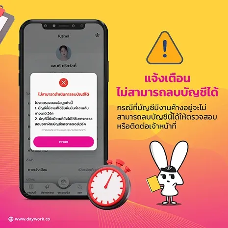 กรณีที่บัญชียังคงมีงานที่รับสมัครค้างไว้ หรือยังไม่ได้ทำการยืนยันการจ่ายเงิน จะไม่สามารถลบบัญชีได้นะจ๊ะ